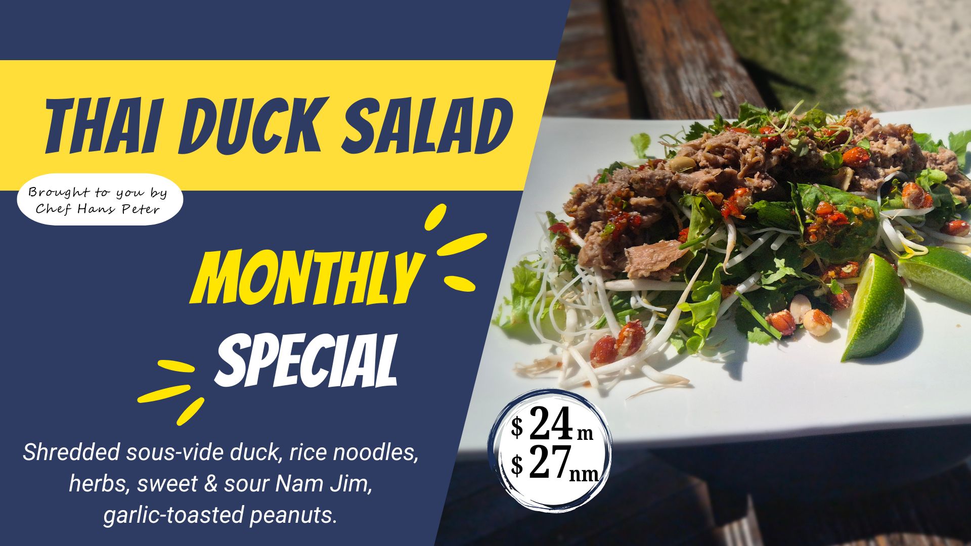 Shredded sous-vide duck, rice noodles, herbs, sweet & sour Nam Jim, garlic-toasted peanuts.