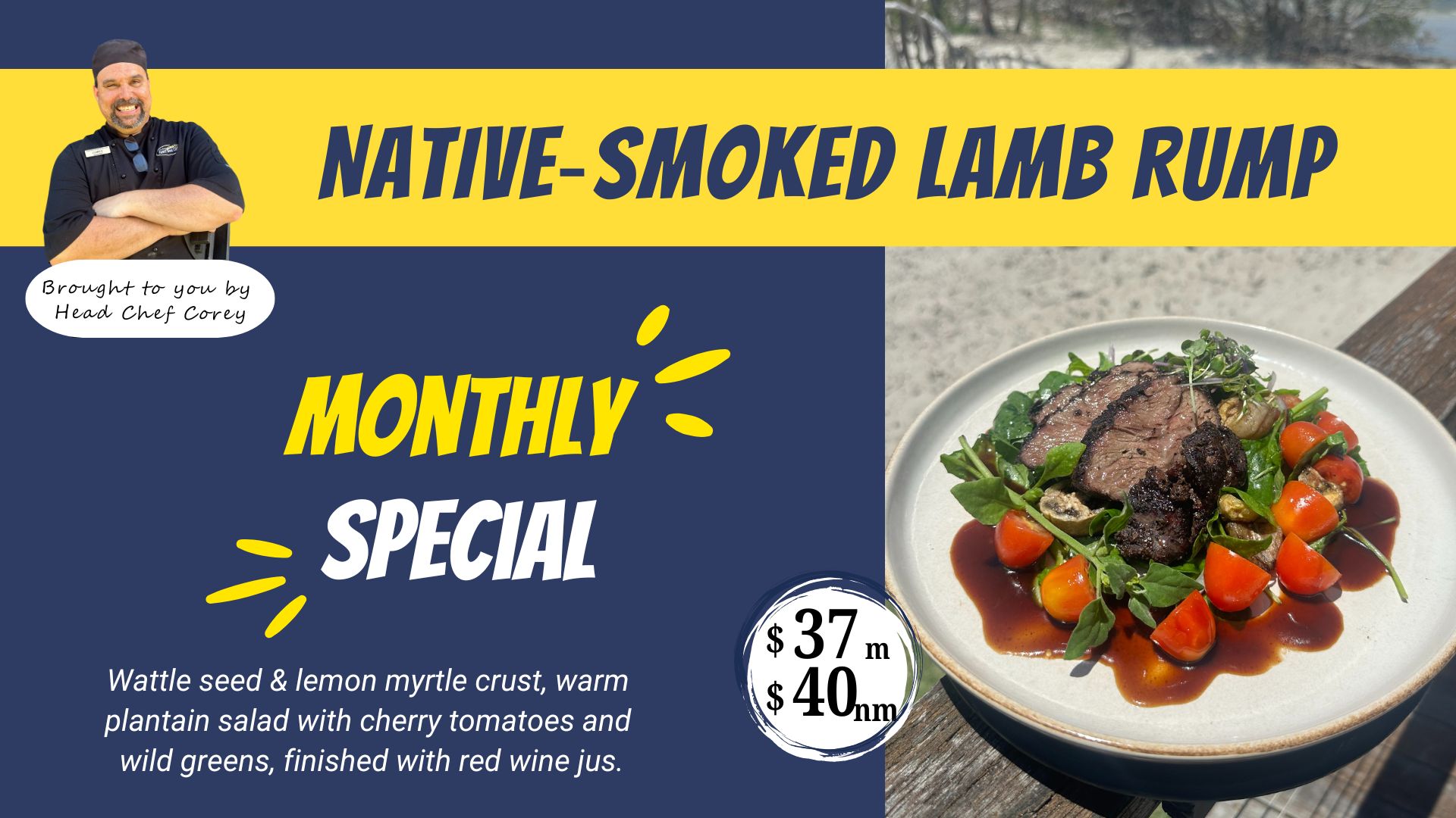 Wattle seed & lemon myrtle crust, warm plantain salad with cherry tomatoes and wild greens, finished with red wine jus.