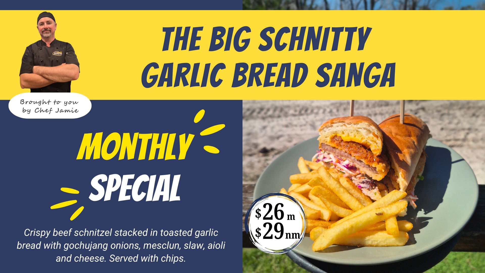Crispy beef schnitzel stacked in toasted garlic bread with gochujang onions, mesclun, slaw, aioli and cheese. Served with chips.