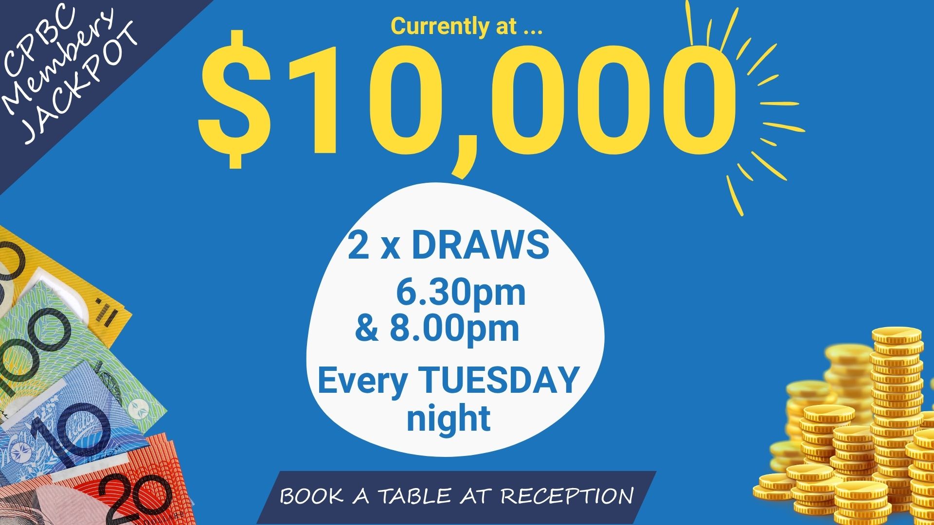 Every Tuesday at 6.30pm & 8pm is the PBC members draw with Jackpot starting at $5,000 (T&C’s Apply).