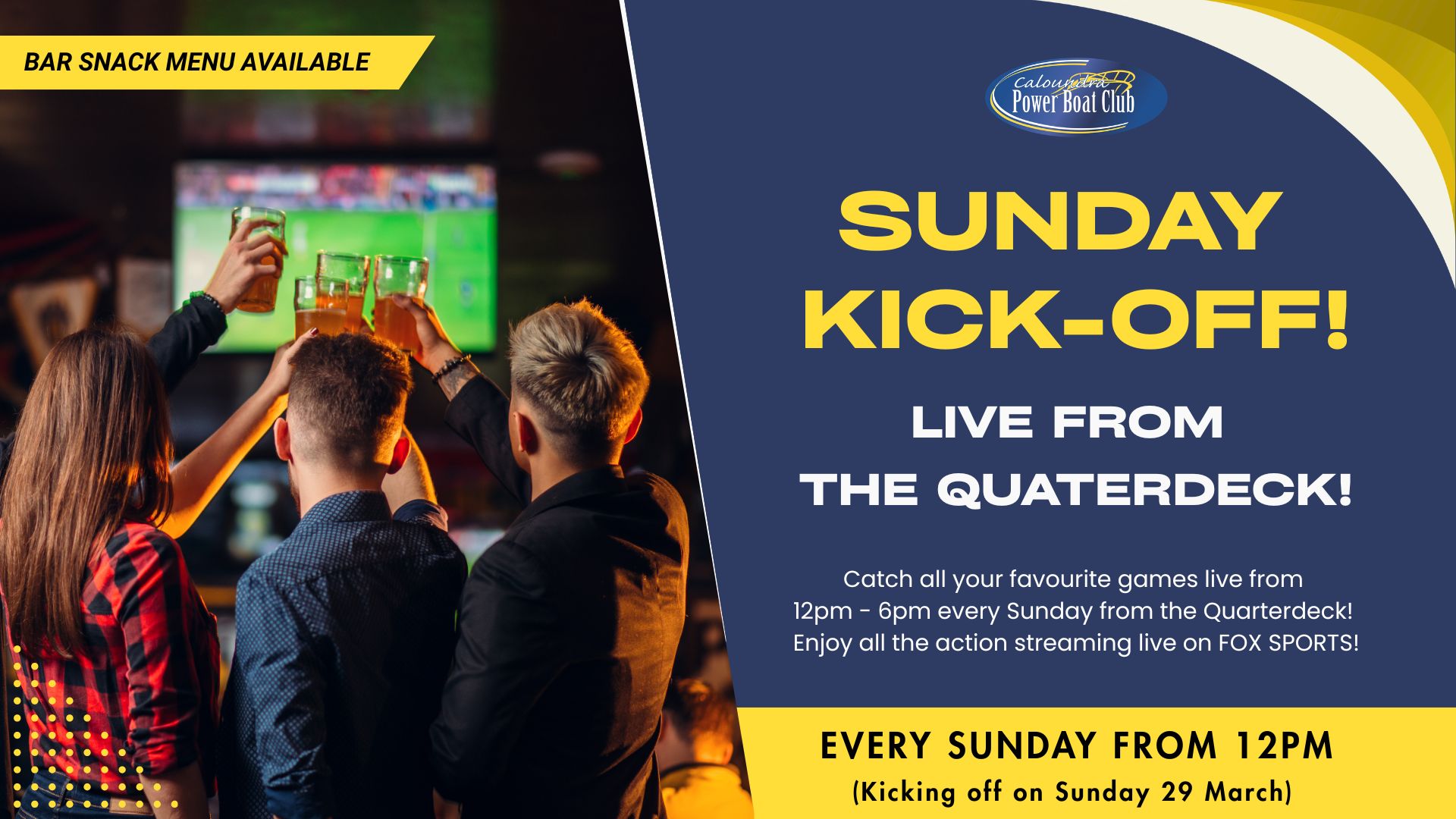 SUNDAY KICK-OFF!LIVE FROM THE QUARTERDECK! Catch all your favourite games live from 12pm – 6pm every Sunday from the Quarterdeck! Enjoy all the action streaming live on FOX SPORTS! EVERY SUNDAY FROM 12PM