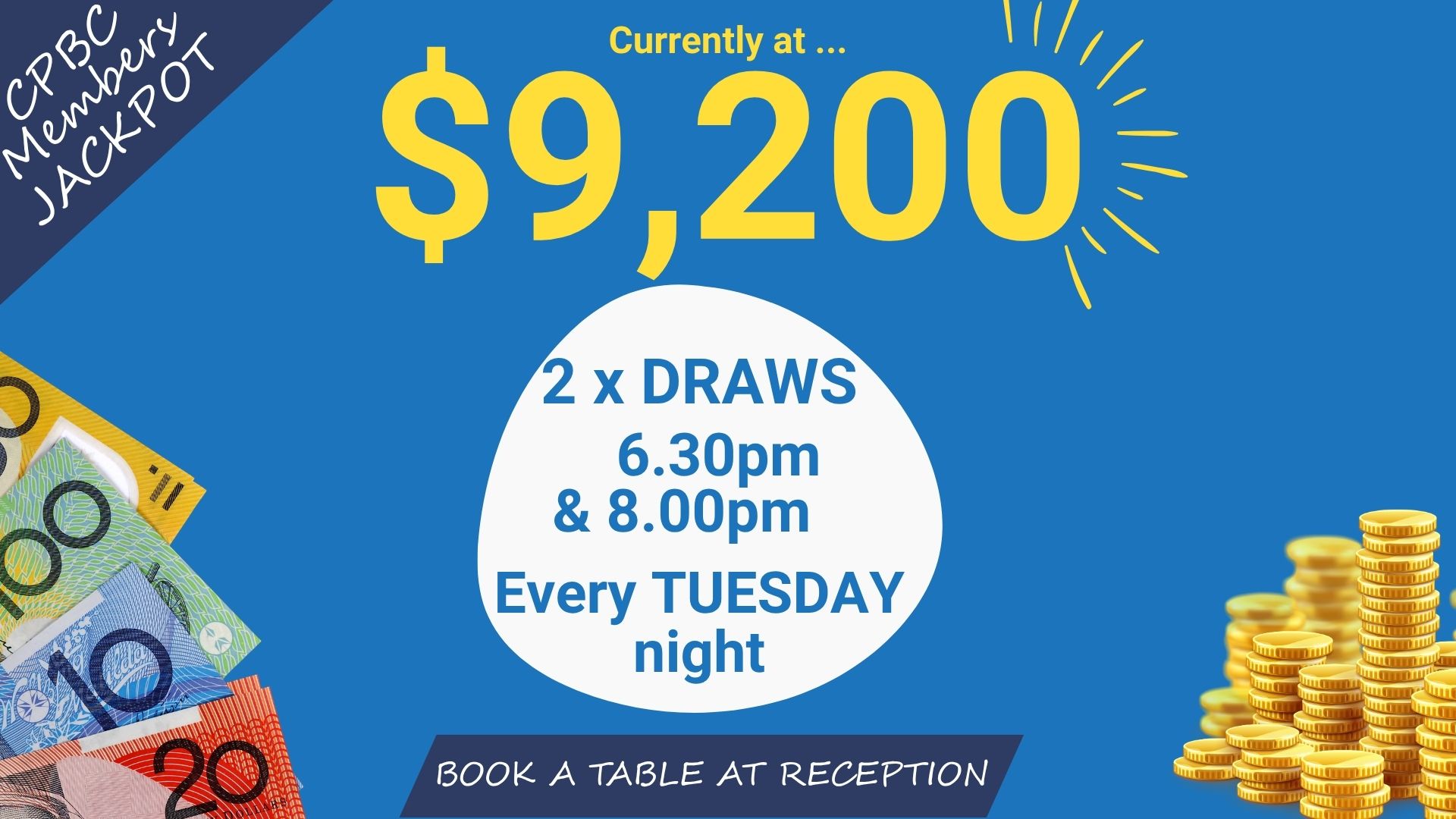 Every Tuesday at 6.30pm & 8pm is the PBC members draw with Jackpot starting at $5,000 (T&C’s Apply).
